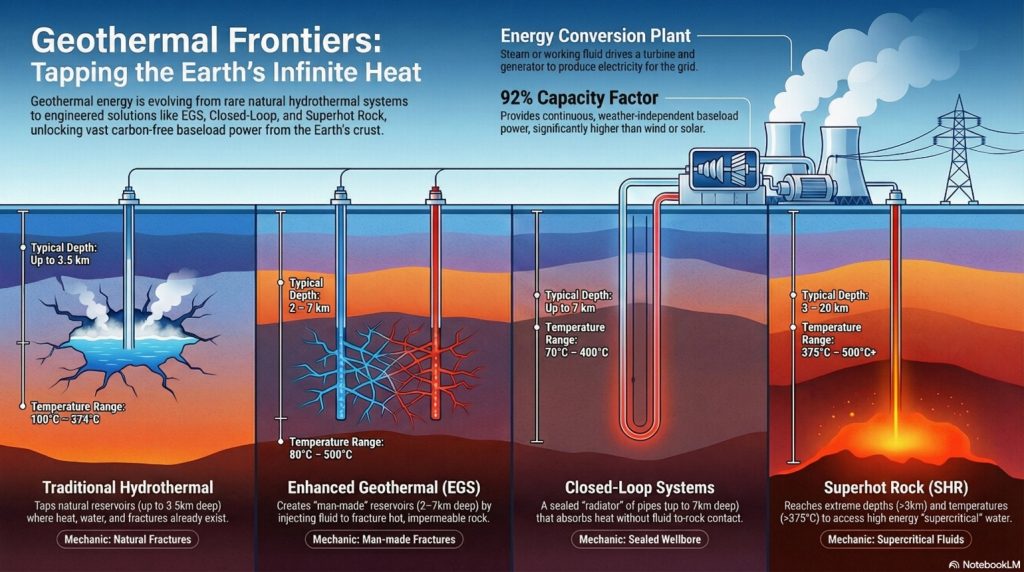 - Closed-Loop Systems (CLS) use directional drilling and pipes to create a system that virtually eliminates subsurface fluid interaction and seismicity risks, though heat transfer efficiency is lower relative to EGS and costs are higher.