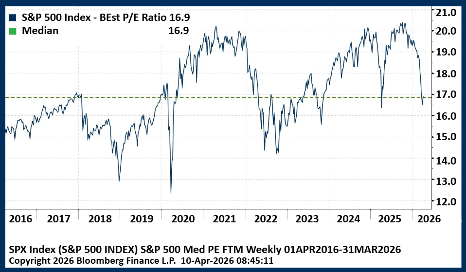 While long-term uncertainties continue to simmer, estimated earnings for 2026 have shifted higher while equity markets have dropped. This has resulted in S&P 500 valuations dropping to last year’s lows as shown in the chart below of the estimated Price/Earnings Ratio (a common valuation measure of how much an investor pays per dollar of estimated corporate profits). This shift in valuations could be an opportunity for long-term investors, but much depends on the path of energy prices from here. If the Iran conflict is wrapped up in a matter of weeks, most economists expect the impact on corporate earnings to be relatively modest and short-lived. In that case, prior trends could reassert themselves and corporate earnings growth in 2026 could expand beyond the technology sector that has been driving earnings growth. This would be a welcome development for a market that has become concentrated following years of narrow market leadership and robust equity returns. If instead the war in Iran rages on for months, increased volatility from economic uncertainty is likely to be compounded by policy uncertainty as mid-term elections approach this fall. While we are mindful of the risks involved, valuations provide some comfort and we remain cautiously optimistic on earnings growth and US equities as a result – especially higher quality areas that can thrive in an uncertain environment.