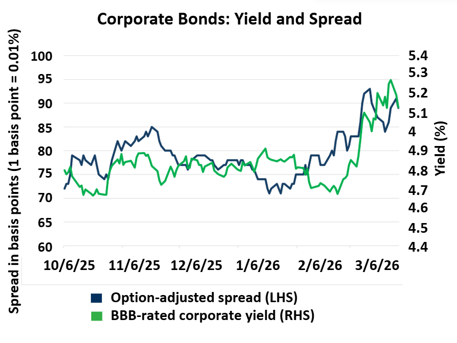 In the near term, Iran-related headlines and the expected duration of the conflict are driving market volatility. Even so, the underpinnings of the US economy remain strong, and we are seeing opportunities resulting from higher interest rates and wider credit spreads. Specifically, we have been buying bonds issued by high-quality companies in the 7-to-10-year maturity range, effectively locking in attractive yields for future years. These may prove especially beneficial if yields decline in the future, which could occur in at least two scenarios. If the conflict in Iran arrives at a satisfactory resolution, inflation concerns may be alleviated. Conversely, if the conflict continues, economic momentum could be derailed. While this is not a desirable outcome, it would likely lead to a decline in rates that would favor longer maturity bonds. Currently, the evidence on the ground from company commentaries suggests a stable US economic outlook, but we are closely watching for evidence to the contrary.