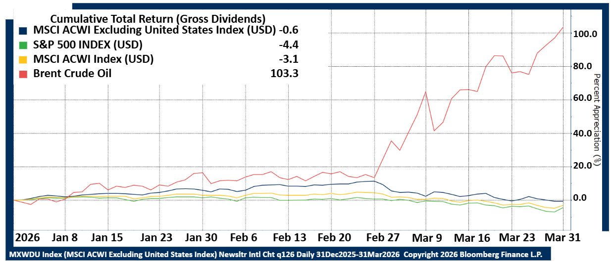 Global equity markets entered 2026 on firm footing, supported by resilient earnings growth and worldwide ongoing AI investment enthusiasm. However, the eruption of the US-Israel-Iran conflict on February 28 sent Brent crude surging above $118 per barrel (up 103% in Q1), reintroducing stagflation risk into the global economy. After three consecutive years of gains and record-breaking resilience, global equities hit a wall in Q1 2026, with the MSCI World Index falling 3.5% for the quarter. Despite the headwind of a stronger US dollar (appreciated 1%), international equities again provided meaningful diversification benefits, with the MSCI ACWI ex-US Index returning −0.6% versus a -4.4% for the S&P 500.